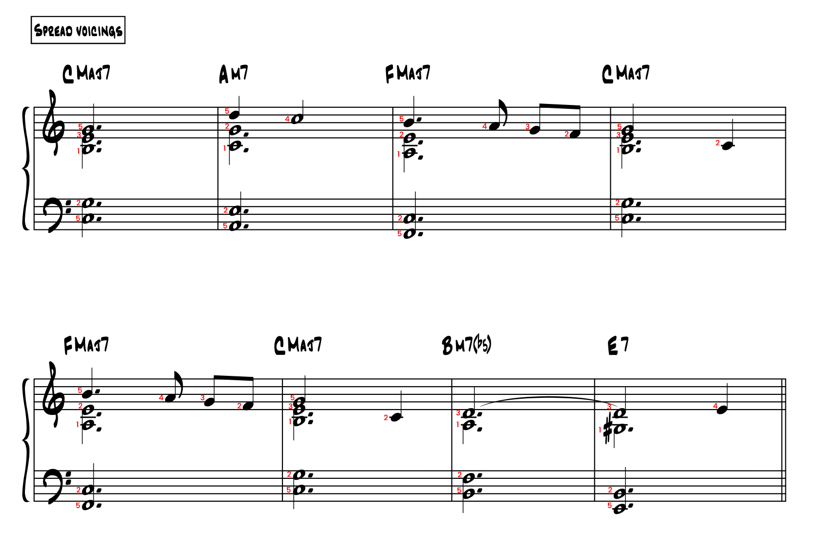 7th Chord Drills: Learn the diatonic 7th chords in the key of C Major and complete the drills in chapters 4 and 5 to help you visualise the notes of each 7th chord split between 2 hands.