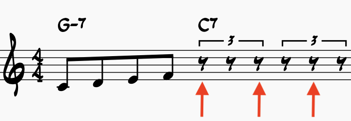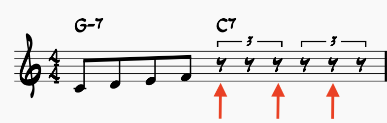 We would then place the triplet quarter notes on beat “3”, the “a of 3”, and the “& of 4” – please see the red arrows in the image attached.